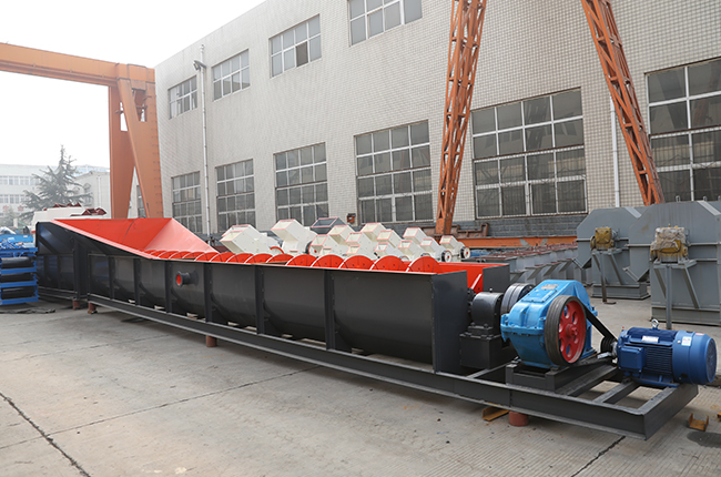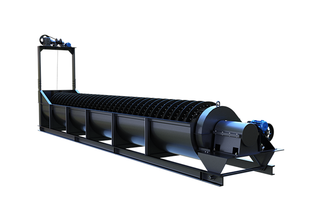 物料由給料箱均勻給入,連續(xù)給主槽體中注入一定量的水,傳動部帶動螺旋軸以一定的速度旋轉(zhuǎn),迫使物料在槽體中翻轉(zhuǎn)滾動并向排料口運動,細粒級物料和雜質(zhì)隨溢流水經(jīng)溢流堰排出,粗粒度物料由排料口排出,從而實現(xiàn)物料的洗選、分級、除雜和脫水。
