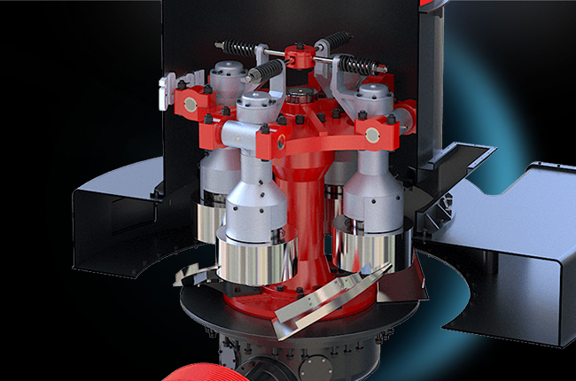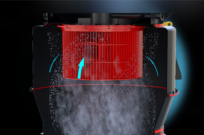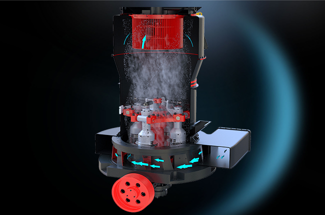 該機(jī)結(jié)構(gòu)主要由主機(jī)、分析器、風(fēng)機(jī)、成品旋風(fēng)分離器、微粉旋風(fēng)分離器及風(fēng)管組成。其中,主機(jī)由機(jī)架、進(jìn)風(fēng)蝸殼、鏟刀、磨輥、磨環(huán)、罩殼組成。雷蒙機(jī)工作時(shí),將需要粉碎的物料從機(jī)罩殼側(cè)面的進(jìn)料斗加入機(jī)內(nèi),依靠懸掛在主機(jī)梅花架上的磨輥裝置,繞著垂直軸線公轉(zhuǎn),同時(shí)本身自轉(zhuǎn),由于旋轉(zhuǎn)時(shí)離心力的作用,磨輥向外擺動(dòng),緊壓于磨環(huán),使鏟刀鏟起物料送到磨輥與磨環(huán)之間,因磨輥的滾動(dòng)碾壓而達(dá)到粉碎物料的目的。