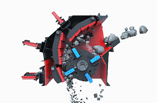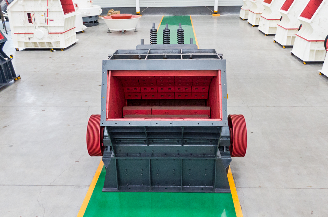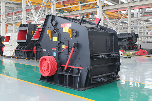 本機(jī)工作時(shí),在電動(dòng)機(jī)的帶動(dòng)下,轉(zhuǎn)子高速旋轉(zhuǎn),物料進(jìn)入板錘作用區(qū)時(shí),與轉(zhuǎn)子上的板錘撞擊破碎后又被拋向反擊裝置上再次破碎,然后又從反擊襯板上彈回到板錘作用區(qū)重新破碎,此過程重復(fù)進(jìn)行,物料由大到小進(jìn)入反擊腔重復(fù)進(jìn)行破碎,直到物料被破碎至所需粒度,由出料口排出。調(diào)整反擊架與轉(zhuǎn)子之間的間隙可達(dá)到改變物料出料粒度和物料形狀的目的。